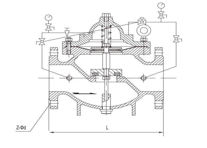 When the outlet pressure of the valve drops to the set pressure of the pilot valve spring, the pilot valve opens and the control room discharges water downstream. Since the water discharge of the pilot valve system is greater than the water inflow of the needle valve, the pressure in the main valve control room decreases. The inlet pressure opens the main valve. In the stable state, the water inlet and drainage of the control room are the same, the opening of the main valve remains unchanged, and the outlet pressure is stable.