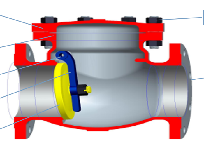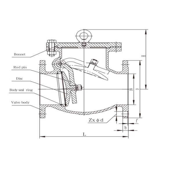 2. This valve is composed of valve body, valve cover, valve disc, rocker and rocker shaft and other parts. The valve disc can automatically prevent fluid backflow. The valve disc of this valve is opened under the action of fluid pressure, and the fluid flows from the inlet side to the outlet side. When the inlet pressure is lower than the outlet pressure, the valve disc automatically closes under the action of fluid pressure difference, its own gravity and other factors to prevent medium backflow.